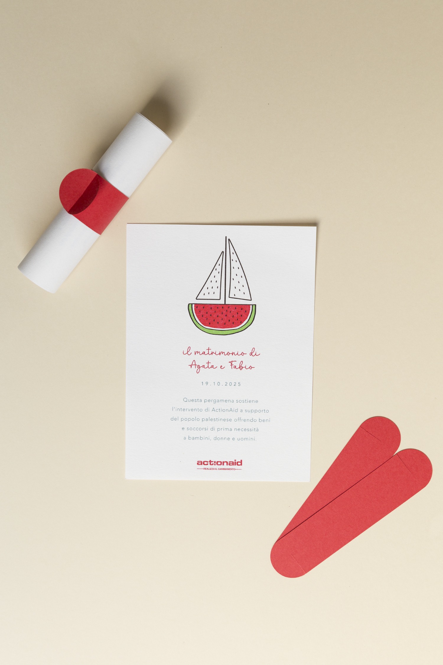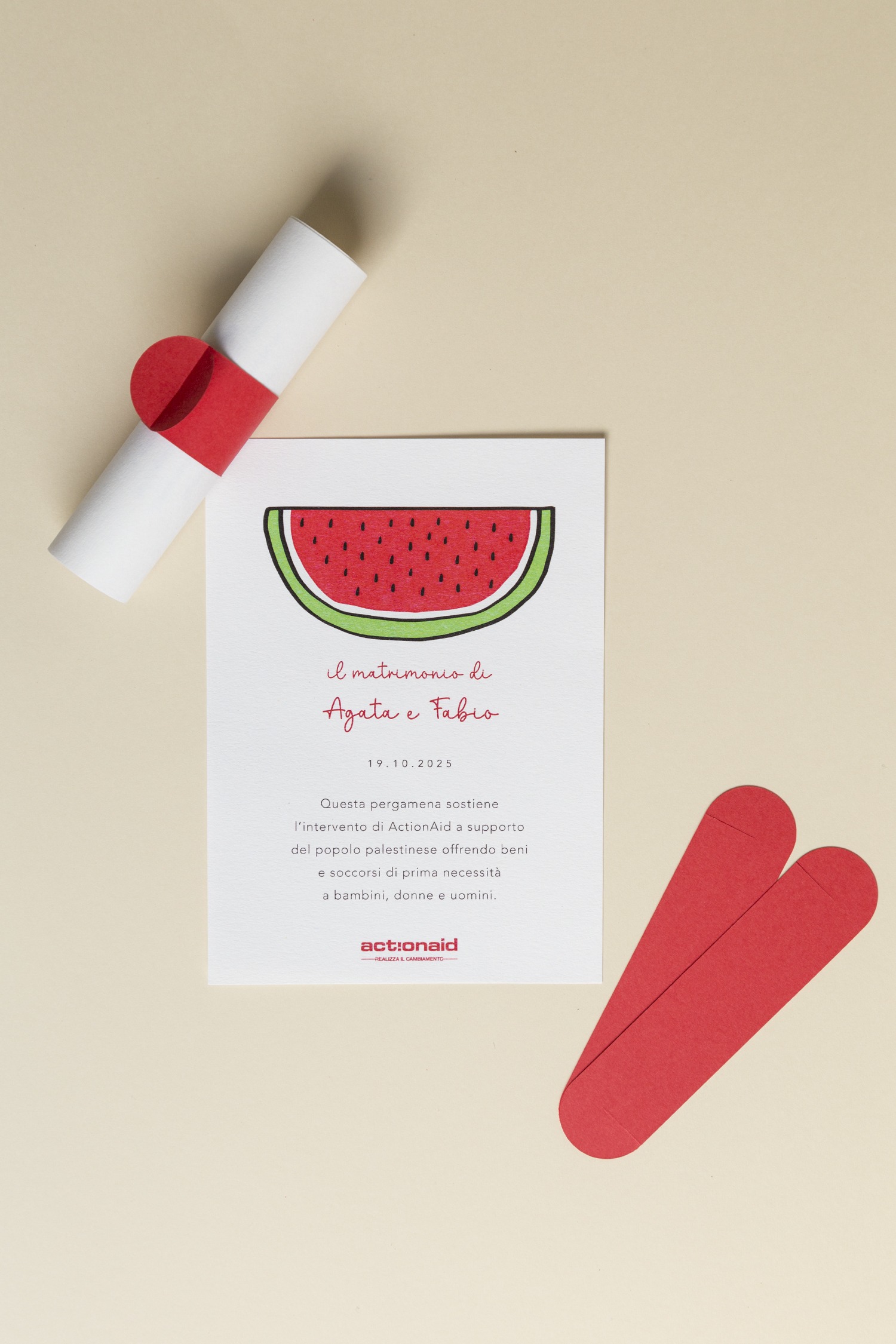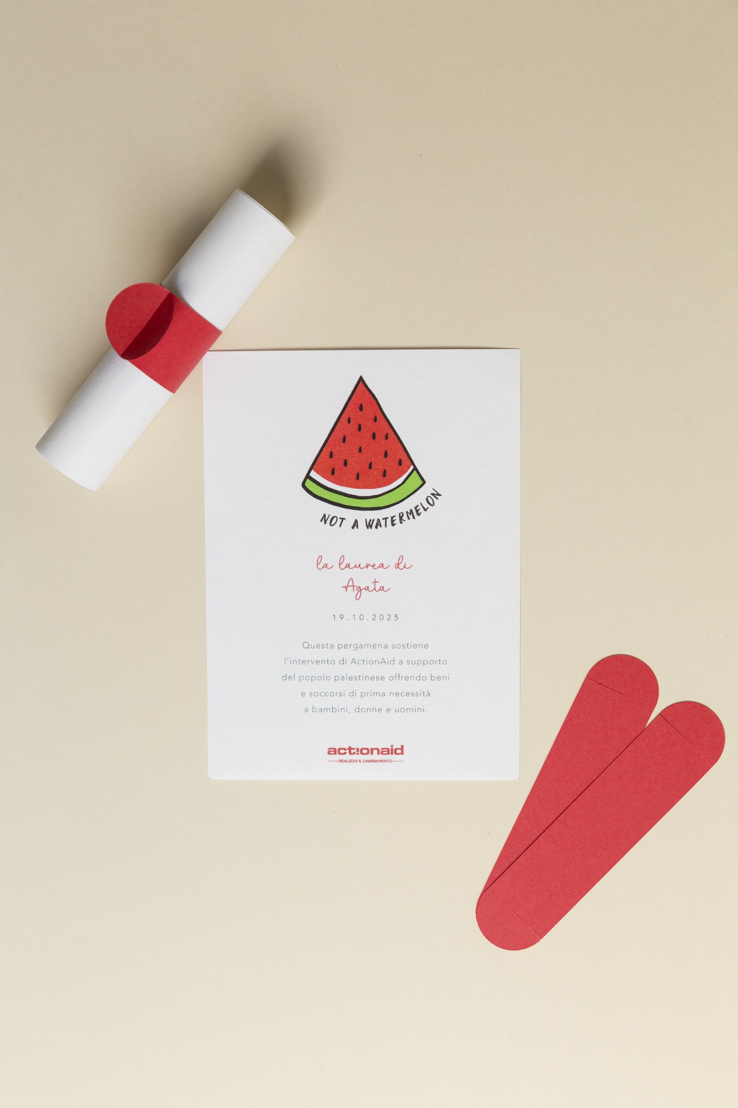 Pergamena con porta pergamena in carta intagliata e abbinata, disponibile in tre varianti artistiche ispirate all’anguria: simbolo di resistenza, libertà e identità per il popolo palestinese.
