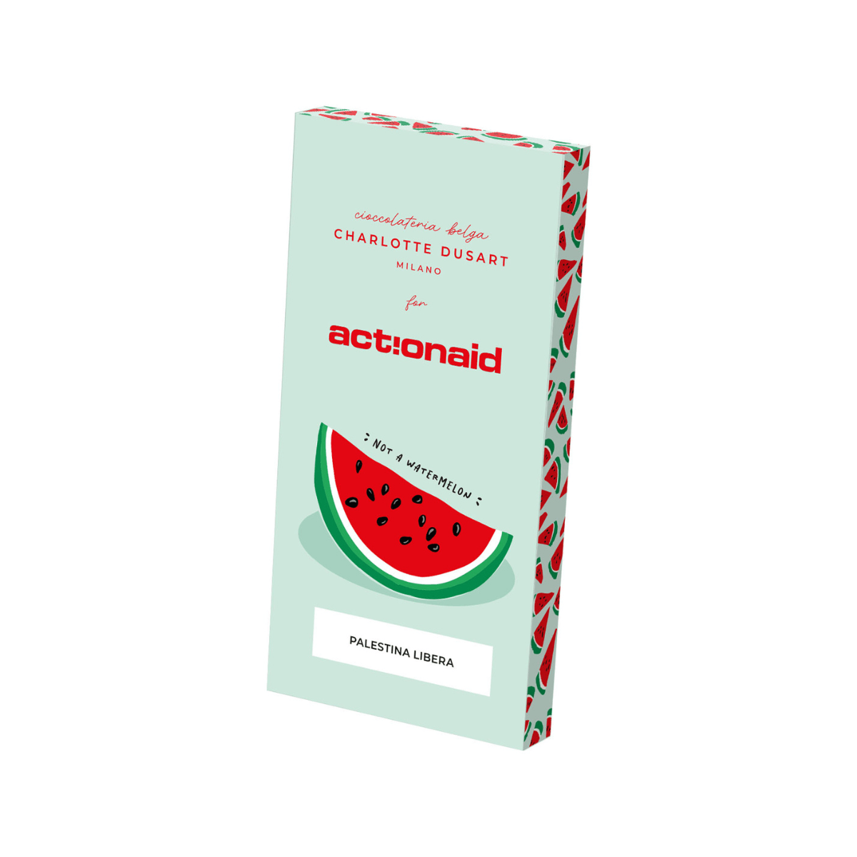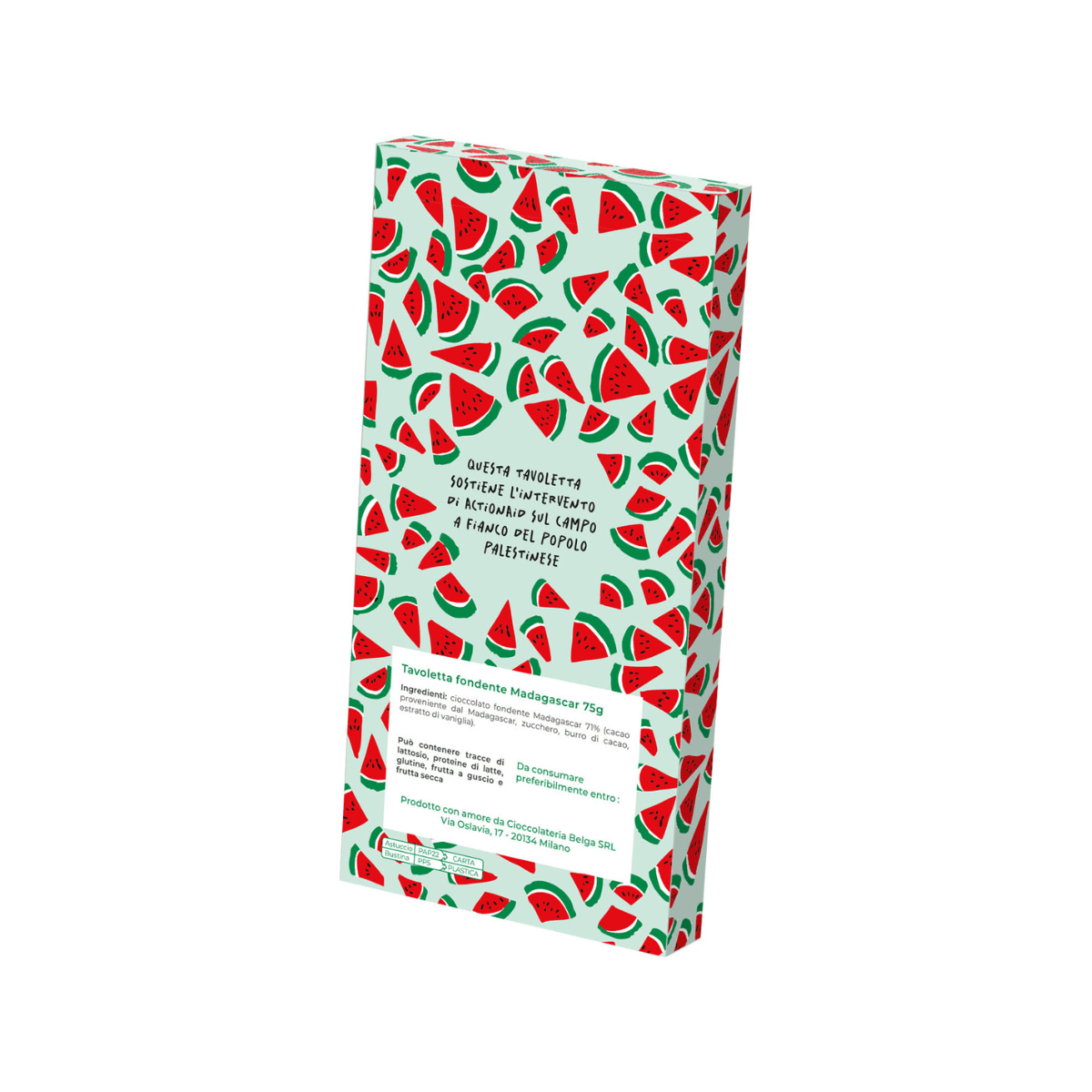 Un packaging vivace e simbolico, decorato con fette d’anguria – simbolo di resistenza – racchiude un gesto concreto di solidarietà.